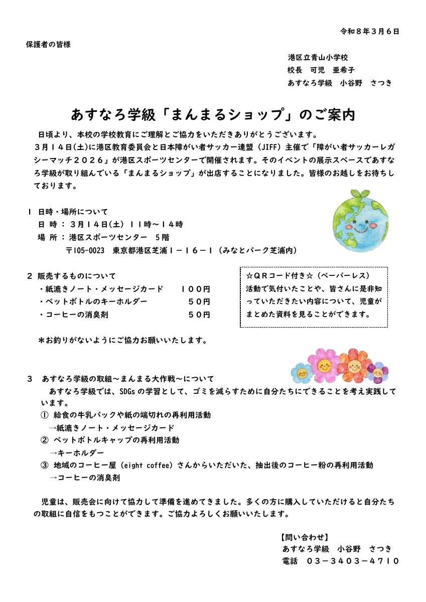 3月14日(土)あすなろ学級の出張まんまるショップがあります。